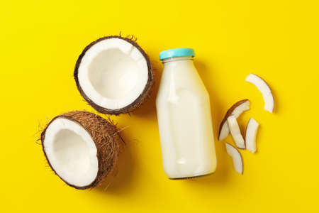 Fresh coconut and coconut milk on yellow background