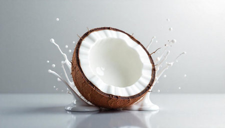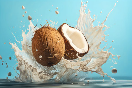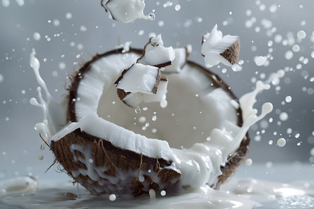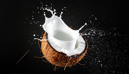 A vibrant image capturing fresh coconut chunks diving into creamy milk, creating dynamic splashes, perfect for culinary inspiration and healthy eating themes.