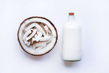 Coconut milk and coconut on white background
