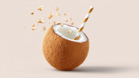 A stunning coconut shell with a striped straw, featuring a splash effect, creates an enticing visual for tropical beverages, ideal for refreshing drink promotions.