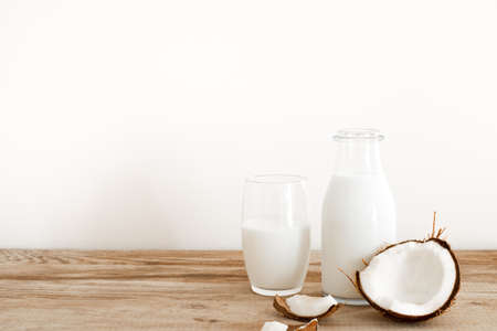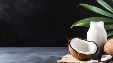 Alternative coconut milk background with jar of milk, coconut and place for text. Plant based eco organic healthy product concept