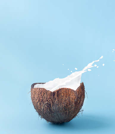 Coconut with milk splash on a blue background, splashing milk in coconut