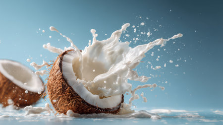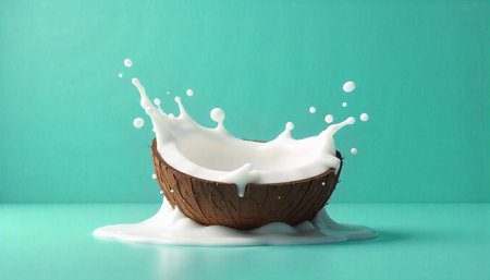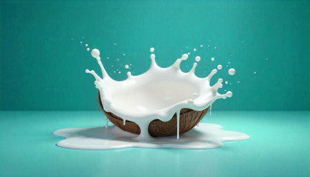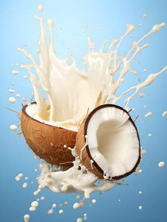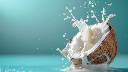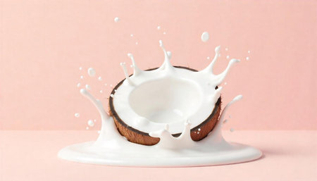 A dynamic splash of coconut milk soars through the air, emphasizing a bright and lively atmosphere ideal for clean plant energy.