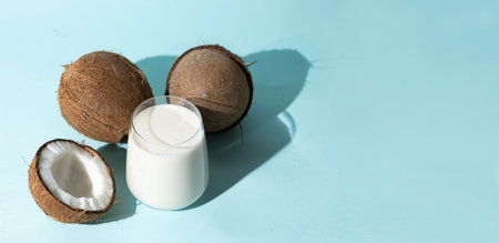 Coconut milk in a glass among coconuts on a blue background, banner with space for text.