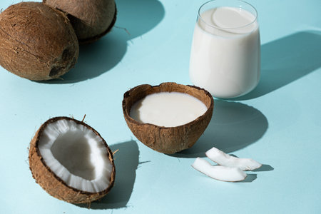 Healthy vegan coconut milk in coconut shell on blue background