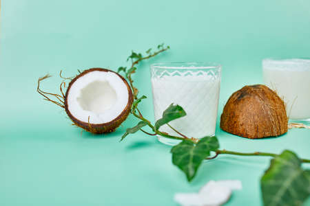 Alternative coconut milk background with glass of milk, coconut and place for text. Plant based eco organic healthy product concept