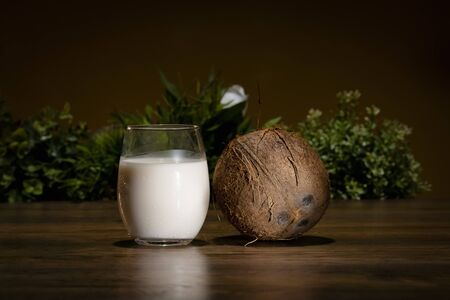 Fresh coconut and coconut milk. Coconut milk in a glass. Alternative milk concept for people with lactose intolerance.
