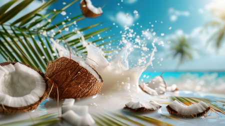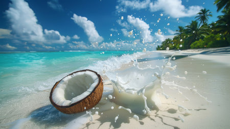 Tropical coconut explosion milk splashes on sandy beach with blue sea backdrop, exotic scene