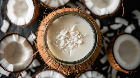 Fresh coconuts are split open to reveal rich, creamy coconut milk, surrounded by coconut flakes, showcasing a traditional preparation method. Generative AI.