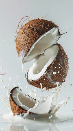 levitating juicy coconut halves fly with a splash of coconut milk