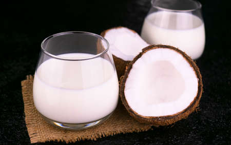 Coconut milk in a glass and fresh coconuts on a black background