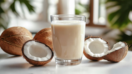 Coconut milk in a clear glass with whole and halved coconuts placed artfully around it on white