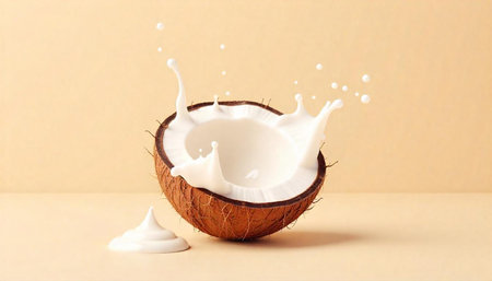 Coconut Half with Milk Splash on Beige Background