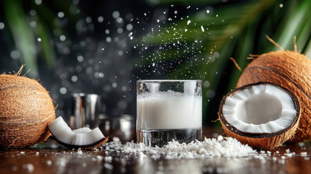 A captivating scene featuring fresh coconut water in a glass, surrounded by shredded coconut on a rustic wooden table, evoking a tropical vibe.