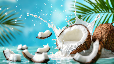 Cracked coconut milk splash with palm tree leaves, blue summer sky and exotic azure tropical sea at the background.
