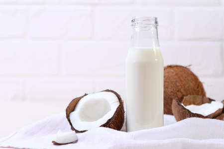 Fresh coconut milk in glass bottle, vegan non dairy healthy drink. Wooden table, close-up. Free space for text, copy space.