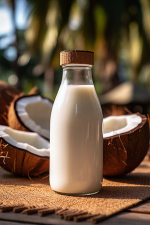 Refreshing coconut milk bottles with fresh coconuts and natural light create a healthy, organic beverage scene.
