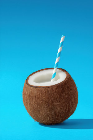 Brown half of coconut nut with white milk and straw inside on blue background. Tropical exotic fruit, cocktail, water for refreshment. Organic natural healthy vegan meal, coco based food concept.