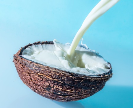 Coconut with milk splash on a blue background, splashing milk in coconut
