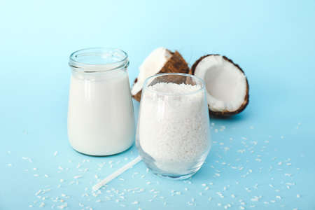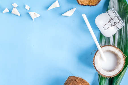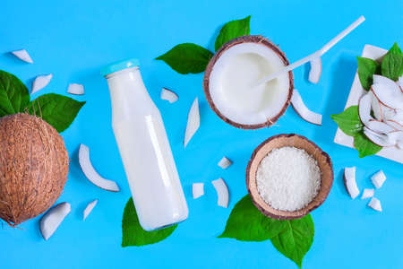 Coconut based foods are scattered on blue background. Alternative white milk in glass bottle, shavings in plate, nut halves are on table. Natural healthy organic vegan vegetarian meal concept.