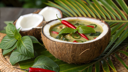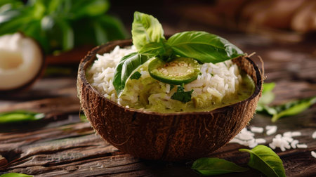 Thai green curry served in a coconut shell, accompanied by fragrant jasmine rice and fresh basil leaves. A delicious and aromatic dish representing the flavors of Thailand