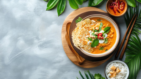 Experience the vibrant flavors of this delicious Asian curry dish, featuring fresh herbs, vegetables, and a garnish of sliced chili. Perfect for any meal.