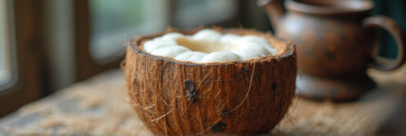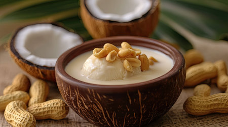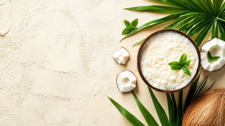 A vibrant display of fresh coconut cream in rustic shells, surrounded by tropical herbs and leaves, perfect for a tropical dessert or culinary inspiration.