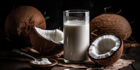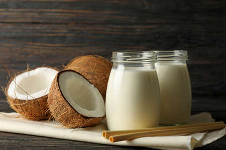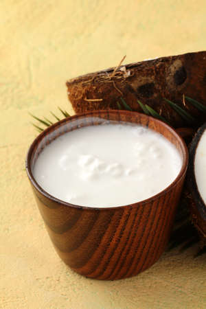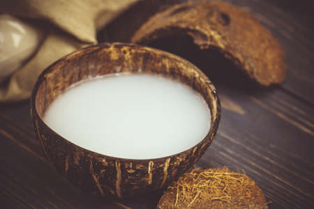 Coconut milk on a wooden background. Coconut and coconut milk. Fresh coconut milk