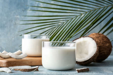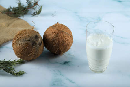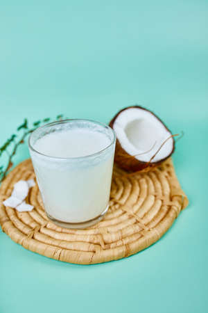 Fresh healthy coconut milk in a glass on blue background, Alternative type of vegan milks, Organic Healthy drink concept.