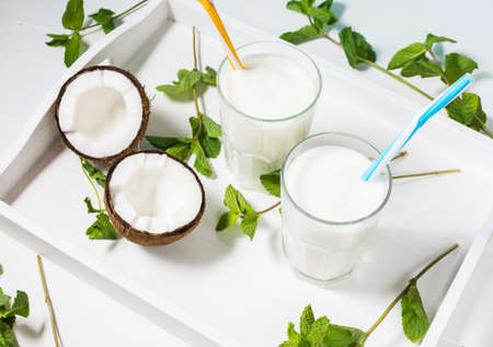 Fresh healthy coconut milk in a glass on wooden table background, Alternative type of vegan milks, Organic Healthy drink concept.