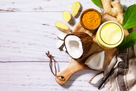 Cup of Healthy ayurvedic drink golden coconut milk turmeric iced latte with curcuma powder on kitchen table. Top view flat lay background. Copy space.