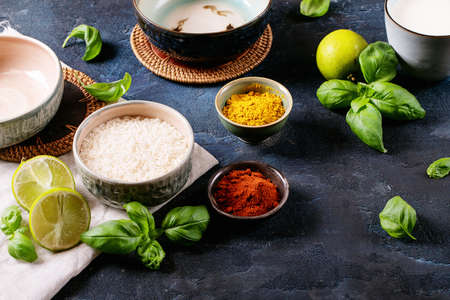 Ingredients for making a bowl of yellow curry served with basil, rice and limes over dark background