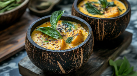 This image showcases a creamy coconut curry served in rustic wooden bowls, garnished with fresh basil and spices, embodying vibrant flavors and warmth.