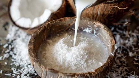 Front view, coconut milk contained in half a coconut is poured in the other half on a dark background