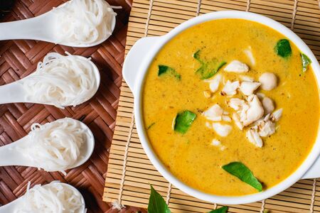 Thai vermicelli eaten with curry, Thai Food, rice vermicelli in black bowl on wooden table