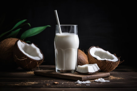 Coconut milk on a wooden background. Coconut milk in a glass bottle , Healthy food , Created with Generative Ai Technology