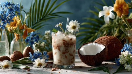 A refreshing coconut drink served with ice and adorned with tropical flowers, showcasing nature's beauty and vibrant colors on a rustic table setting.