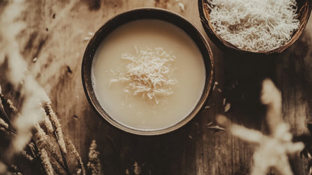 A creamy bowl of coconut milk topped with freshly shredded coconut, set against a rustic wooden background. Perfect for a healthy snack or dessert option.