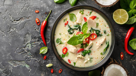 A vibrant layout featuring creamy coconut soup surrounded by fresh herbs, spices, and chili peppers on a dark textured background. Perfect for culinary themes.