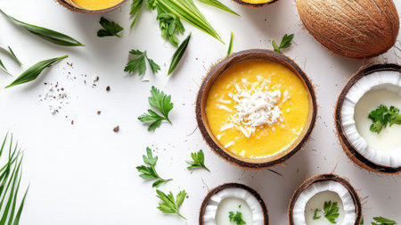 A vibrant creamy coconut dish garnished with fresh coconut flakes and cilantro. Perfect for showcasing tropical cuisine and healthy eating concepts.