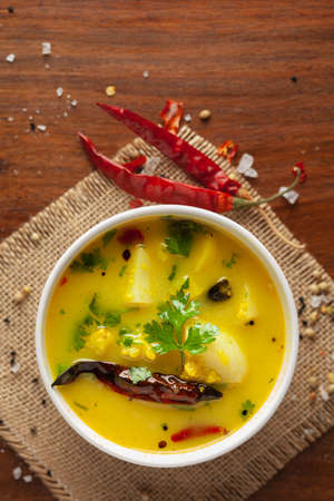 close-up of healthy curry of yogurt and potato (Dahi Aloo or Aaloo ) an Indian Classical dish. Served in Black bowl. Over Wooden Background and jute mat. Top view