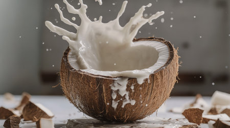 Milk splashing out of a coconut shell placed on a white surface with coconut pieces around it