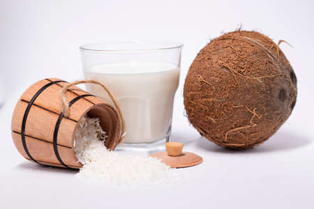 fresh coconut near wooden bowl with coconut flakes and glass of coco milk. isolated on white background. tropical nut.