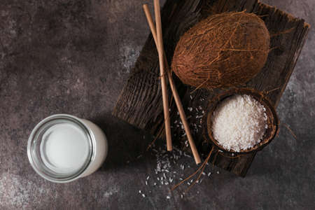 Bottle of coconut vegan milk with straws, whole coconut and flakes