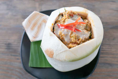 Spicy curry streamed seafood in young coconut cup called Hor mok in Thai. Made from ground fish with coconut milk, red chili curry paste, basil and keffirlime leave julian. Popular dish in Thailand.