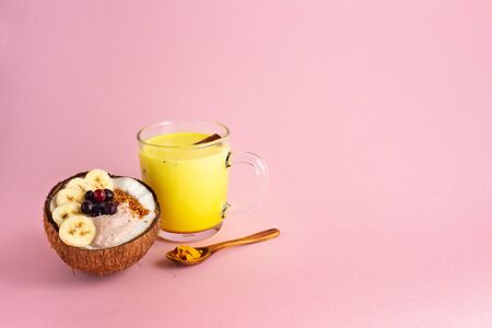 Tasty appetizing smoothie made from blackberries, bananas, cacao and yogurt with turmeric golden milk. Served in coconut bowl. Healthy life eating concept on pink background. Copy space