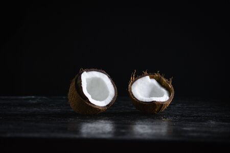 ripe coconut is broken into two halves isolated on a black background close-up. the insides of the tropical palm fetus.
