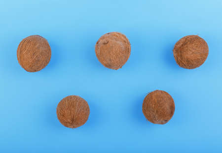 Close-up of whole and exotic coconuts on a bright blue background. Nutritious vegan diet. Exotic tropical nuts. Natural, organic whole coconuts on a blue background. Five fresh cocos.
