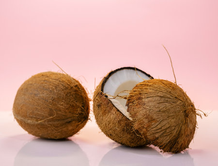 Coconut halves on a pastel pink background. Summer tropical food poster.