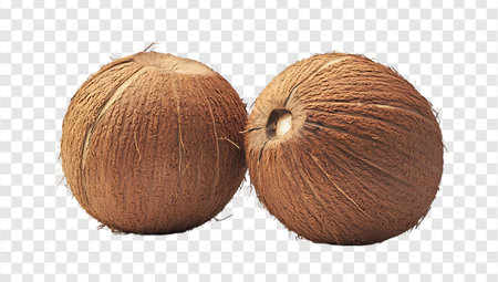 Two coconuts, one of which is split, on a transparent background